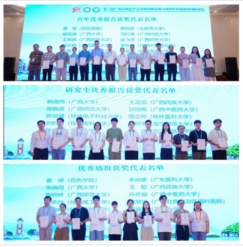 为推动多维度学术碰撞,论坛设置“1个主会场+6个分会场”的多层次交流架构,包含了12场大会报告、39场邀请报告、61场青年学者报告及66场研究生快闪报告,并同步展示了75份高质量学术墙报,内容涵盖有机化学、药物化学、化学生物学、分子靶标与药理学、精准诊疗、蛋白降解与修饰等前沿领域,从技术创新、学科融合、人才培育等维度展开深度研讨,全面呈现最新研究成果与发展趋势。论坛还评选并颁发了优秀青年报告奖、优秀快闪报告奖和优秀墙报奖。随后,下一届承办方广西大学进行了第四届广西有机化学论坛宣讲,论坛在组委会桂林医科大学张业教授的回顾总结下成功闭幕。