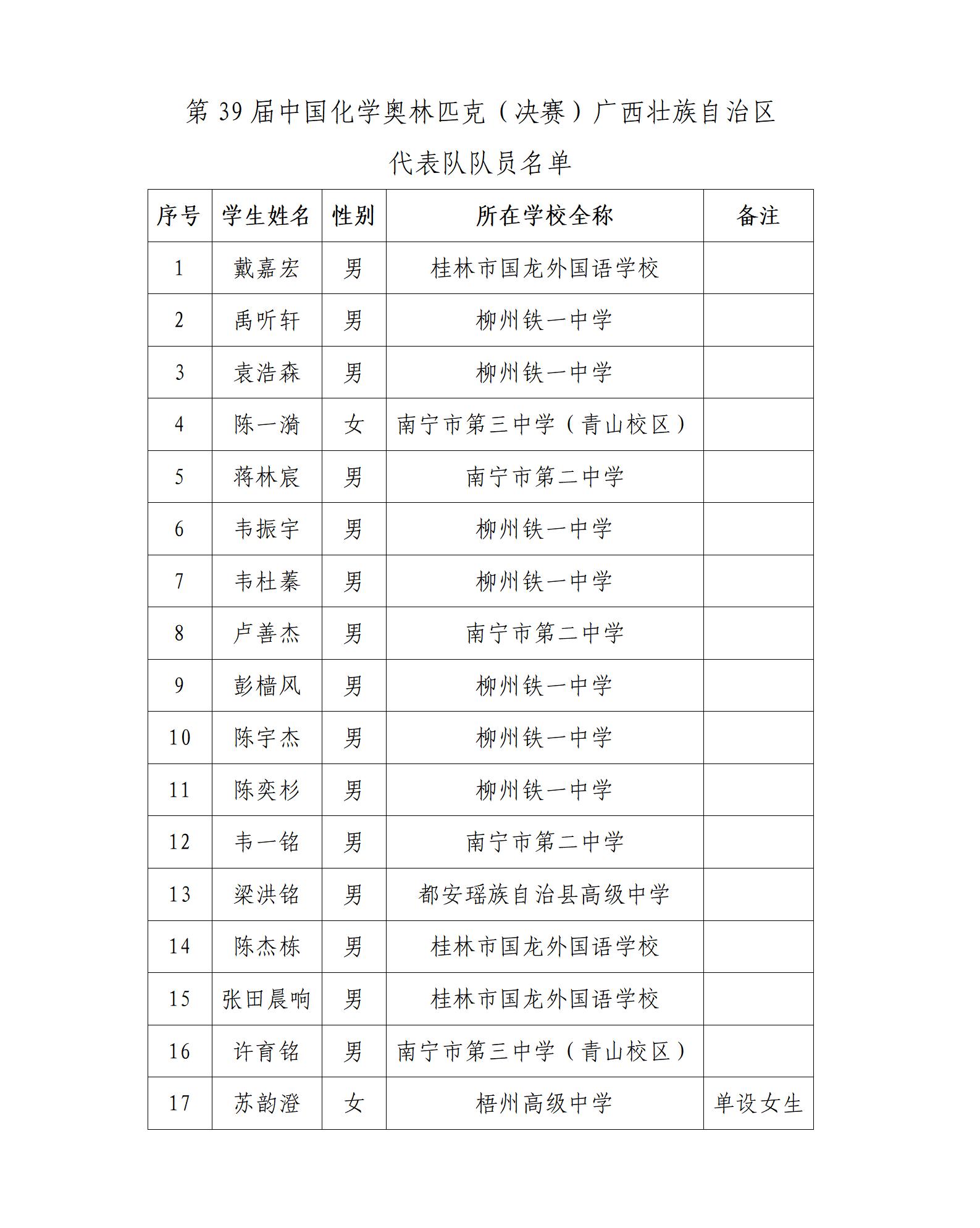 经中国化学会核定,第 39 届中国化学奥林匹克(决赛)广西壮族自治区代表队指标共 17 名,按照遴选规则(以初赛成绩排序),正式确定第39届中国化学奥林匹克(决赛)广西壮族自治区代表队队员名单,现予以公布。
